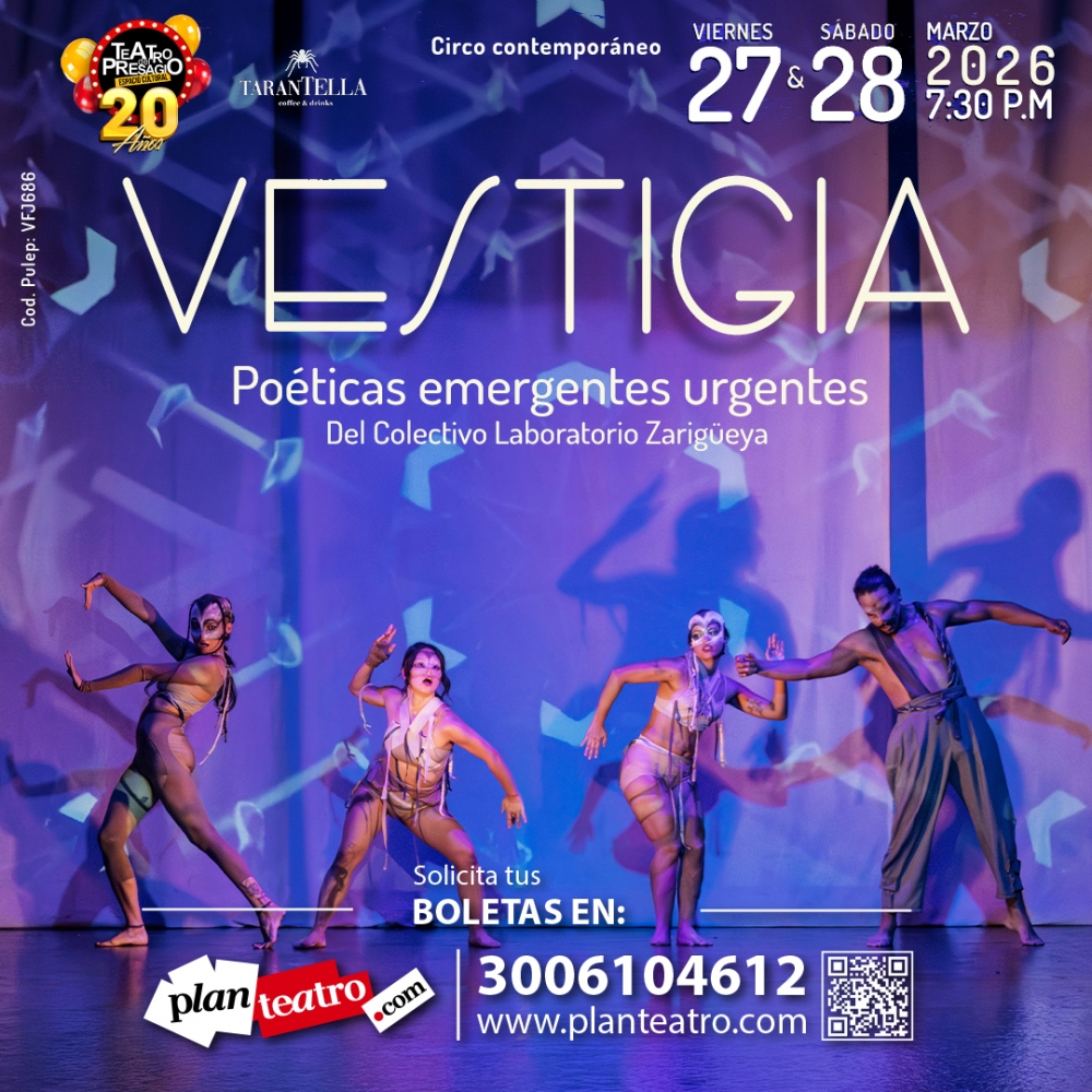VESTIGIA es una intervención escénica multidisciplinar que explora los lenguajes del CIRCO CONTEMPORÁNEO con herramientas audiovisuales y voz en vivo. La investigación indaga en la relación de lxs caleñxs con los entornos naturales, así como con las demás especies que habitan este territorio. VESTIGIA crea una atmósfera sensible para abordar las tensiones entre NATURALEZA y SOCIEDAD MODERNA, desde poéticas emergentes para estos tiempos urgentes.